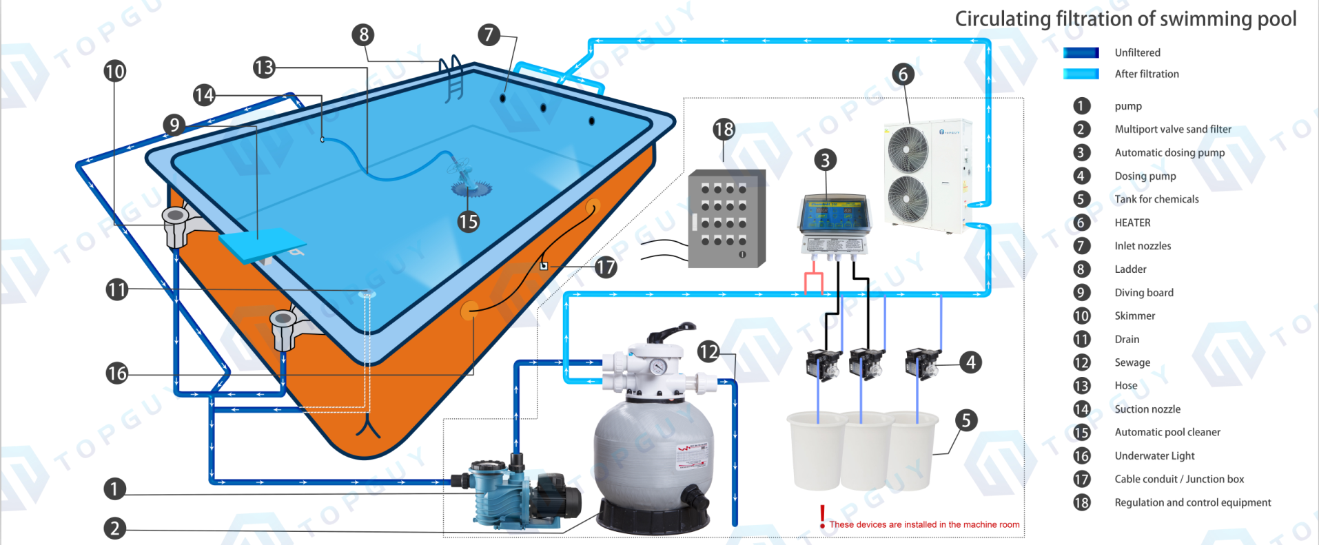 على كل من المطهر ORP (الذيل الفعال لتقليل الأكسدة أو الأكسدة) ودرجة الحموضة المائية في حمامات السباحة والمنتجعات الصحية. جميع وظائف التشغيل محددة