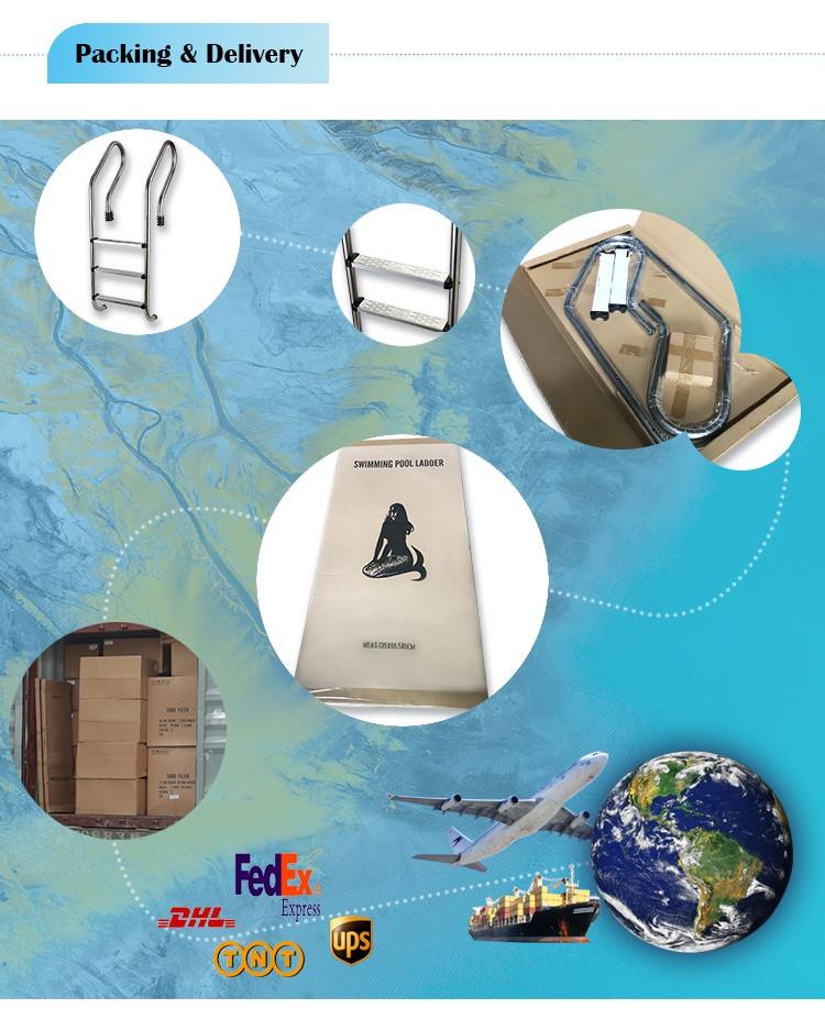 صُنع سلم حمام السباحة من سلسلة MU من قطر الأنبوب = 42 مم ، 304 أو 316 درجة من الدرابزين الفولاذي المقاوم للصدأ مع تشطيب مصقول ومصقول.تأتي السلالم كاملة مع خطوات من الفولاذ المقاوم للصدأ مع إدخالات غير قابلة للانزلاق أو خطوة بلاستيكية ، ومصدات مطاطية ، وتركيبات تثبيت لإبقاء السلم أقرب إلى جدار حمام السباحة.